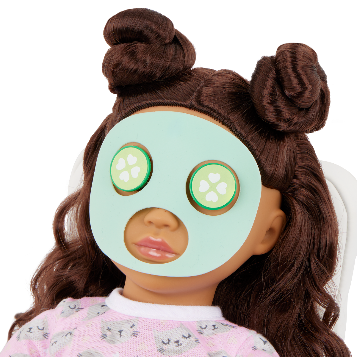 Dream up slumber parties and spa day fun with Larissa! This Our Generation 46cm doll has a huggable soft body and lifelike features to delight doll fans during playtime. Her wavy, dark-brown hair can be styled in many ways, while her beautiful brown eyes really close when it's time for sweet dreams! She arrives wearing a kitty-themed pyjama and a pair of slippers. Plus, she comes with bonus accessories to play out sleepover stories. This set includes a kitty-themed sleeping bag, a bowl of popcorn, 2 cookies, a glass of chocolate milk, 2 bottles of pretend nail polish, and a full face mask with 2 cucumber slices. When it's time for dress-up, her outfit has easy-open closures to quickly put on and remove. So you can mix, match, and create more stylish looks on any adventure! Our Generation dolls make a great gift for kids ages 3+ (small parts), encouraging them to imagine their own unique stories.