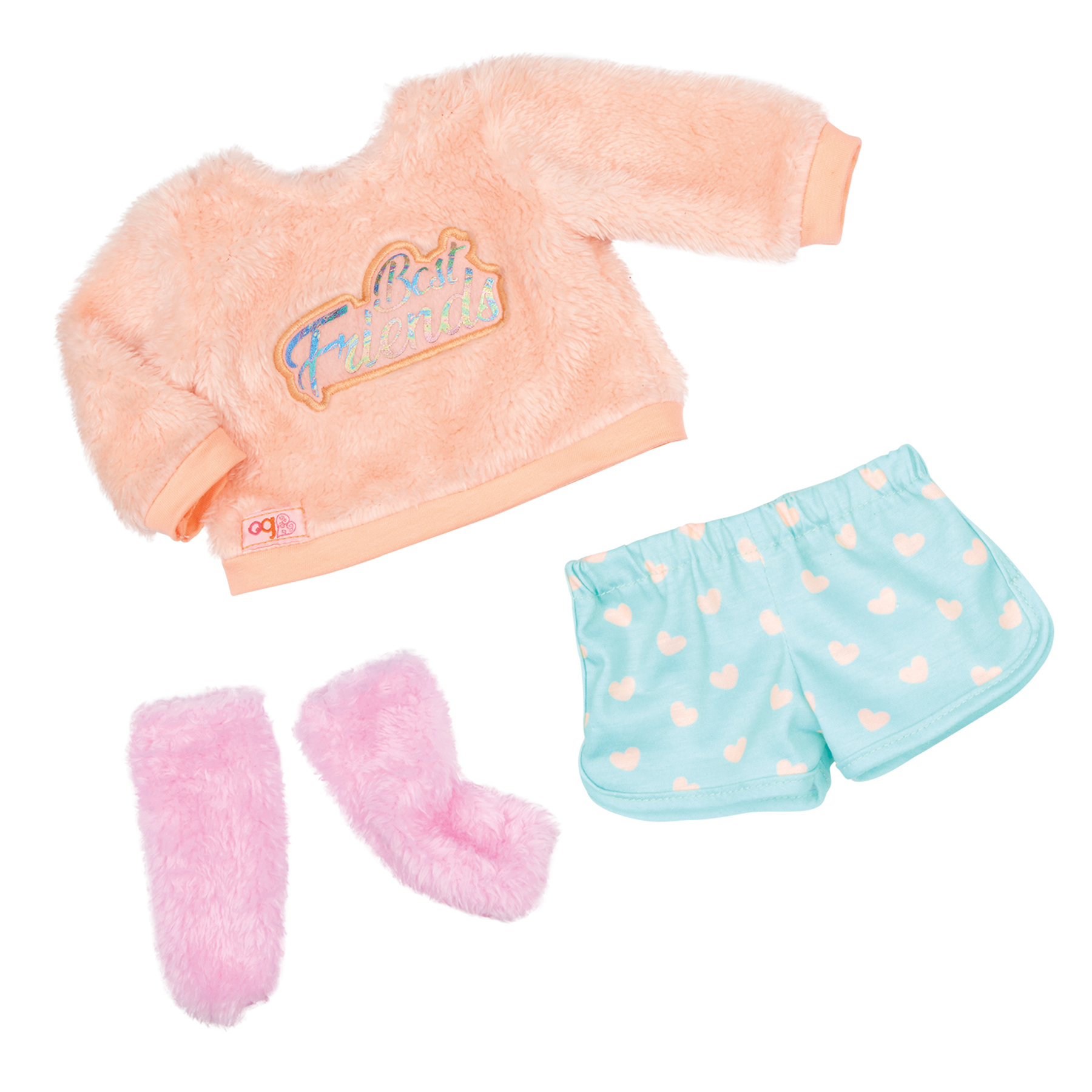 • Slumber Party Style: Lumi arrives wearing a fuzzy "Best Friends" sweater, heart-print pyjama shorts, a pair of undies, and pink fuzzy socks.