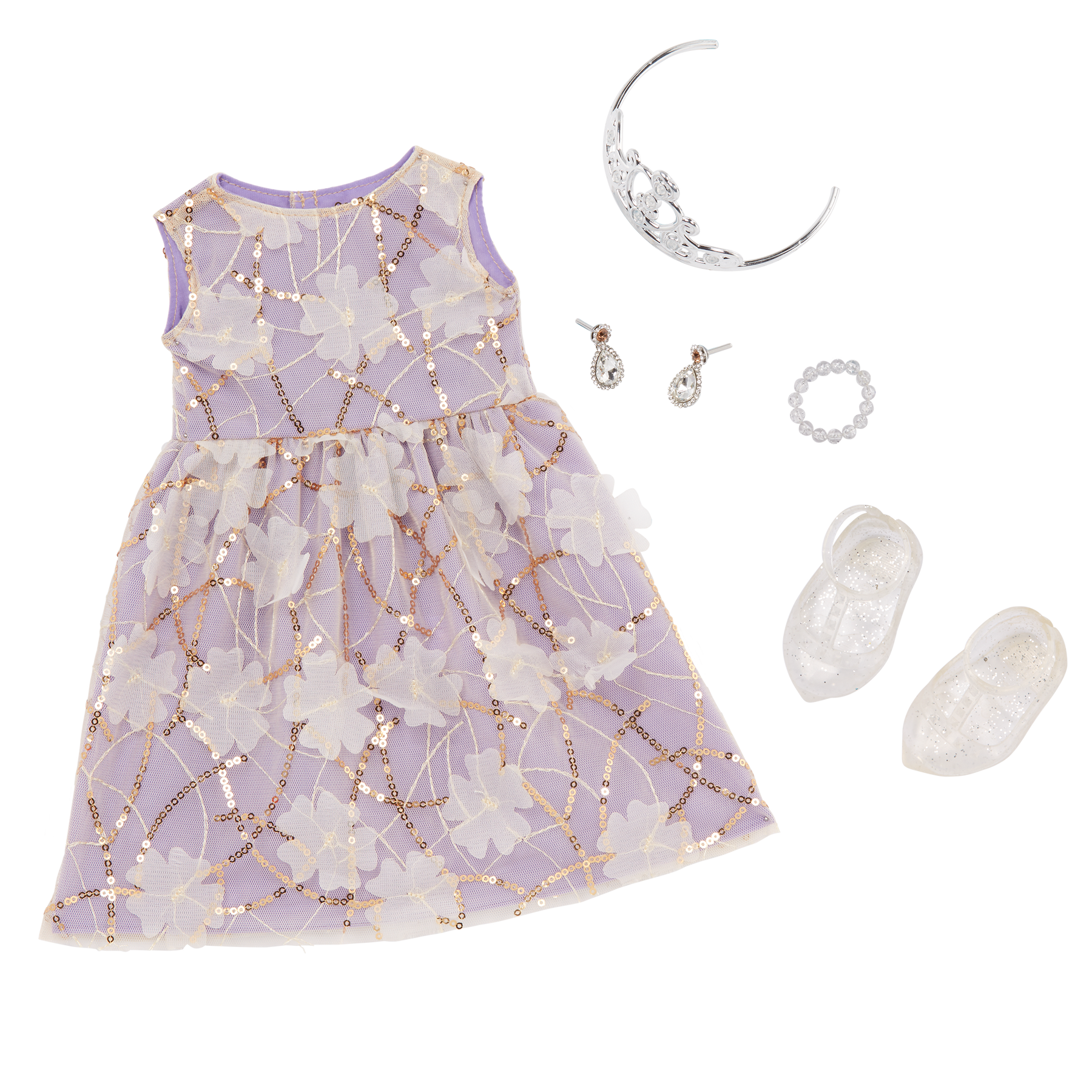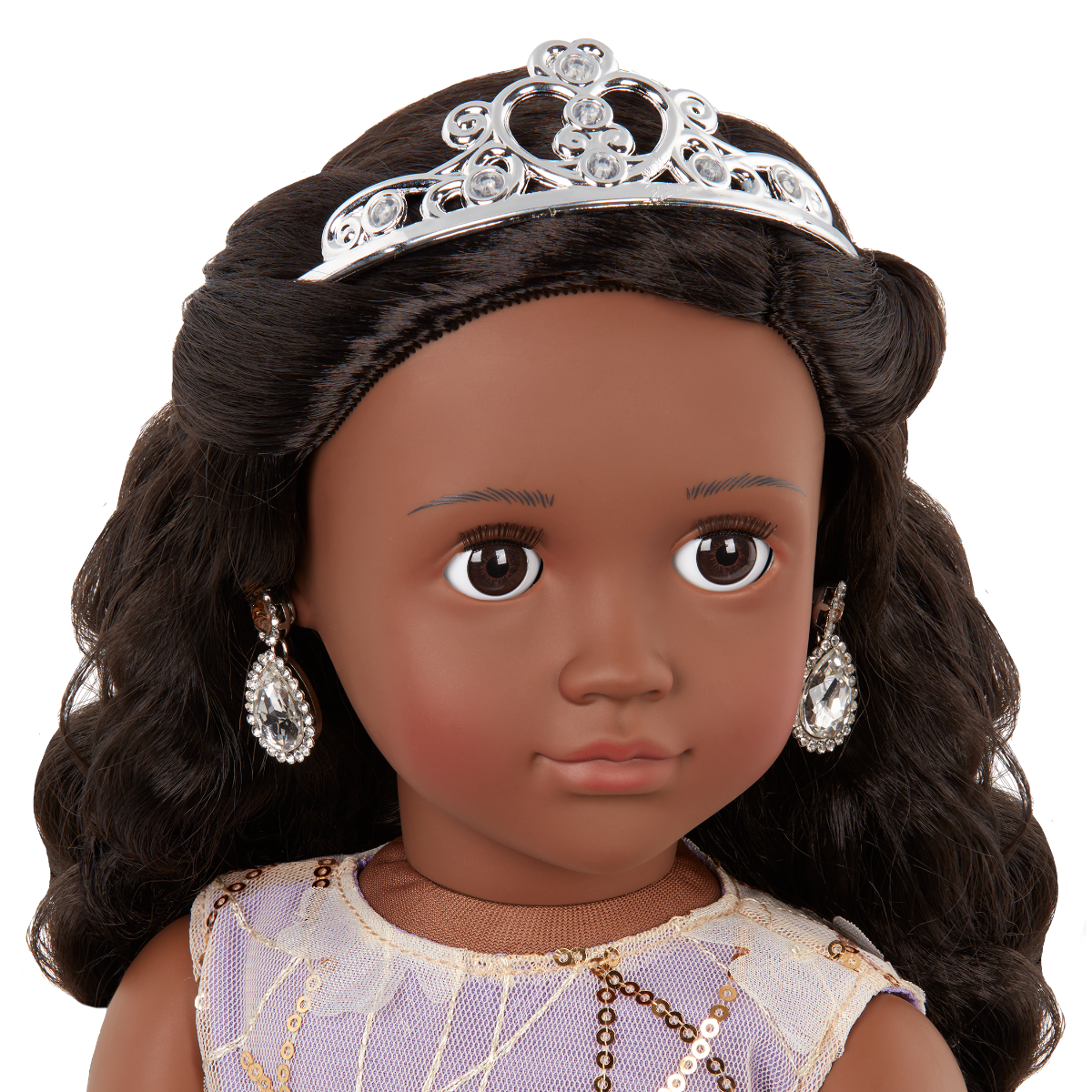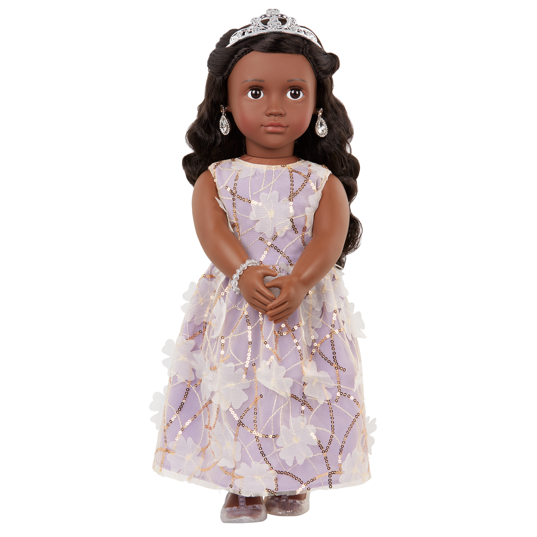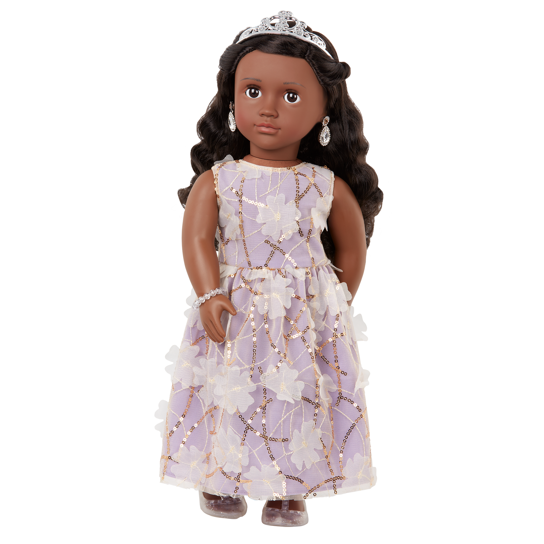 Celebrate special events and shine bright with Ambreal! This Our Generation 46cm doll has beautiful brown eyes that open and close with long, brushable brunette hair that's fun to style. Give Ambreal pretty ponytails, braids, updos, and more fun hairstyles before accessorizing with her tiara. Then help her sparkle with her jewellery collection, including a beaded bracelet and a pair of super cute earrings - she has pierced ears! Ambreal has a cuddly soft body and can rotate her neck, arms, and legs to easily change outfits. She arrives wearing a lovely floral gown decorated with golden sequins and a pair of shimmering shoes. Ambreal's gown also features easy-open closures to quickly put on and remove, so you can dress her in more fun Our Generation styles to prep for any adventure!