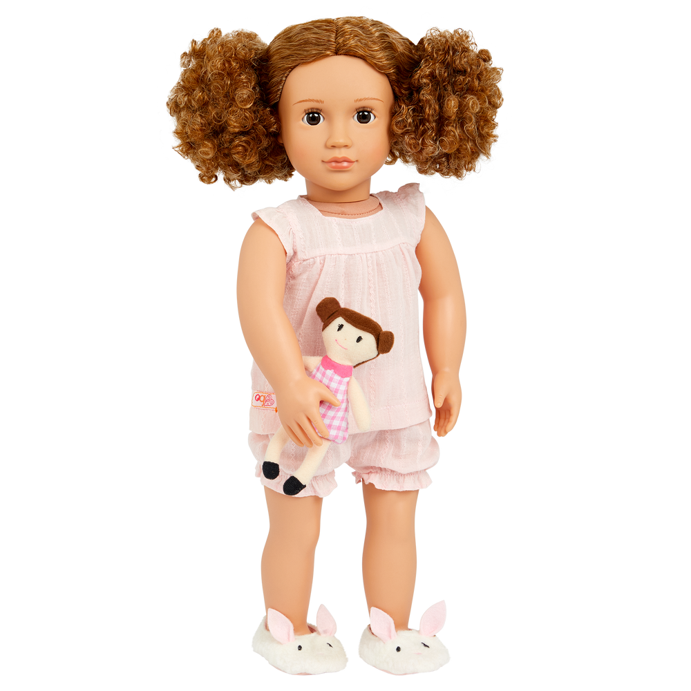 Dress up for slumber parties and bedtime fun with the Our Generation Pyjamarama outfit for 46cm dolls! This doll clothing set includes a pretty pink pyjama top with matching bloomer bottoms that add a touch of retro style. Plus, it comes with a mini plush doll and bunny slippers for a delightfully dreamy look! This doll pyjama outfit has easy-open closures to quickly put on and remove. So kids can mix and match for more fun styles as they explore imagination and self-expression. Our Generation doll clothes make a great gift for kids ages 3+ (small parts), encouraging them to create their own unique stories. Compatible with most 46cm dolls, doll clothes, and accessories. Dolls sold separately.