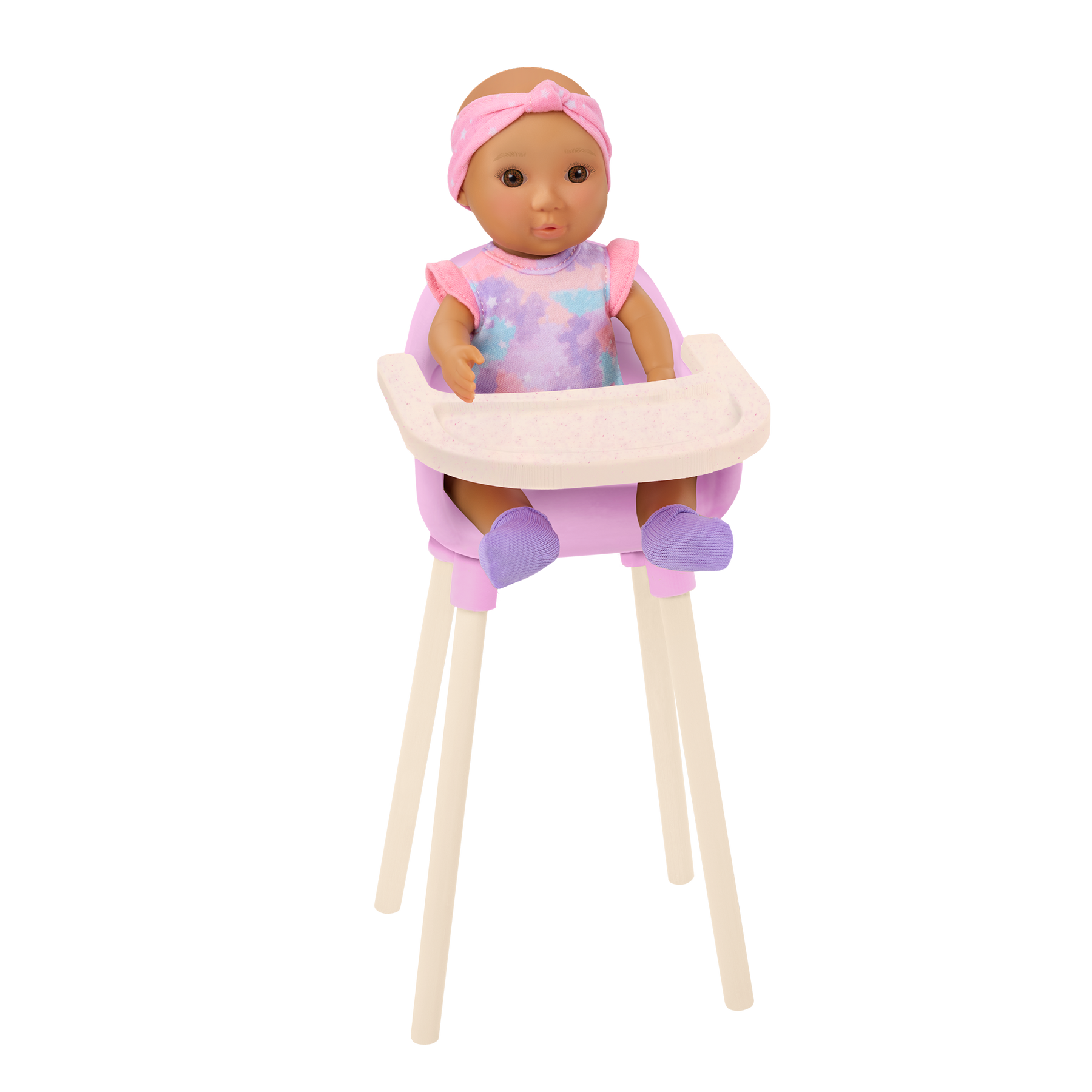Serve up spoonful's of joy with the Our Generation Baby Emilia & Mealtime Set! This adorable playset gives kids everything they need to role-play daily meals and fun feeding sessions. Seat Emilia in the high chair and fasten her bib to prep her for the first course. Kids will love "scooping" pretend food from the plates and jars with the utensils. Plus, the interactive baby bottle is filled with pretend milk that really moves inside, while the bags of cookies and yoghurt unveil mini food clusters for Emilia to enjoy. A mealtime chart helps kids learn about nutrition and introduces healthy foods, and a range of stickers let them rate each new food they try! Emilia is dressed in an easy-change outfit, featuring a colourful onesie, matching headband, and cosy socks. She also comes with a washcloth and baby wipe container to inspire fun cleanups. Makes a great gift for kids ages 3 years old and up (small parts), encouraging them to create stories and scenarios that involve caring for others.