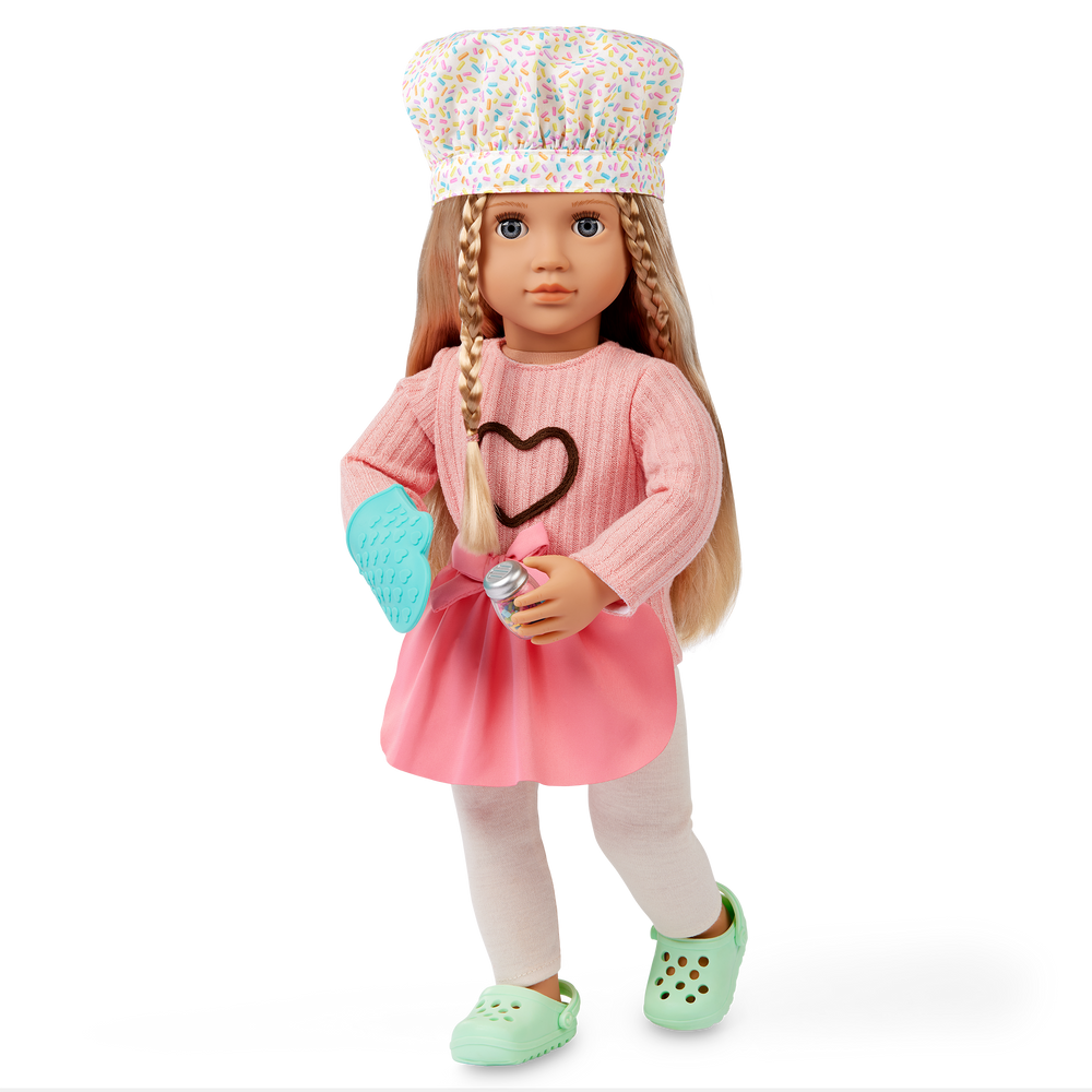 Bake up sweet treats and sweeter stories with Our Generation 46cm doll Emery! She's about to enter a bake-off competition on a popular kids' TV show with her best friend Paola. But… they have very different ideas about which special dessert to make. What happens when best friends disagree? Follow this tasty adventure in her storybook, Baking with Love, to see where her story takes her! More shy and quiet than Paola, Emery's baking talents speak volumes as she uses inventive ingredients (like confetti!) to craft her extraordinary treats. She comes with a complete outfit and themed accessories, letting kids play out the ultimate baking challenges and create their own playtime recipes. Emery has a huggable soft body and lifelike features that will delight doll fans for hours of playtime, from her beautiful grey eyes that open and close to her styleable blonde hair. Plus, her bendable arms and legs inspire added poses! Compatible with most 46cm dolls, doll clothes, and doll accessories. Our Generation dolls make a great gift for kids ages 3 years old and up (small parts).