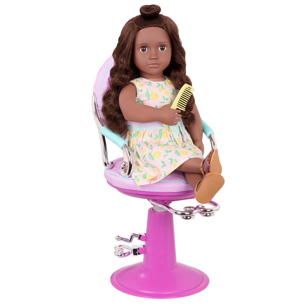 Exciting new hairstyles for dolls are at your fingertips with the Our Generation Sitting Pretty Salon Chair, a 7-pc salon chair accessory set for 46cm dolls! This doll salon chair is covered in a pretty quilted lilac hearts fabric. It's the perfect addition to any doll beauty parlor! The Sitting Pretty Chair comes with lots of fun, pretend salon accessories like a blow dryer, a flat-iron for straightening hair, hair clips, scissors, and a spray bottle. Use the foot pedals to raise and lower the chair so that it's at just right height for you! Seat your dolls in the chair and secure them with the safety strap – it's suitable for both posable and non-posable dolls! There's no limit to how many cool hair-dos you can design with a little imagination. Check out the entire collection of Our Generation hair and beauty products for dolls for even more fun! (Dolls and outfits sold separately)