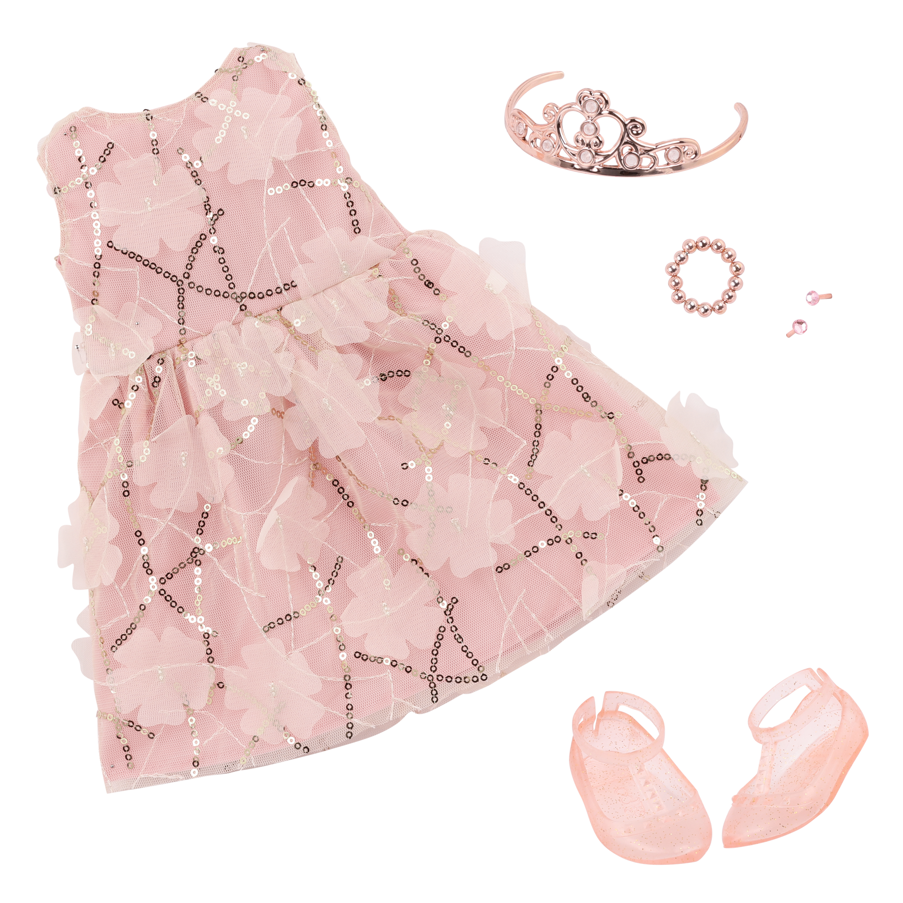 Shine bright on every celebration with Eleanor! This Our Generation 46cm doll has lifelike hazel eyes that open and close with gorgeous platinum blonde hair that's fun to brush and style. Give Eleanor pretty ponytails, braids, and updos before finishing the look with her tiara. Then help her sparkle with the jewellery bracelet and earrings (she has pierced ears)! Eleanor has a huggable soft body and can rotate her neck, arms, and legs to easily change outfits. She arrives wearing a lovely pink gown decorated with golden sequins and detailed florals. Eleanor's gown also has easy-open closures to quickly put on and remove. So you can dress her in more fun Our Generation clothing sets to prep for any adventure!