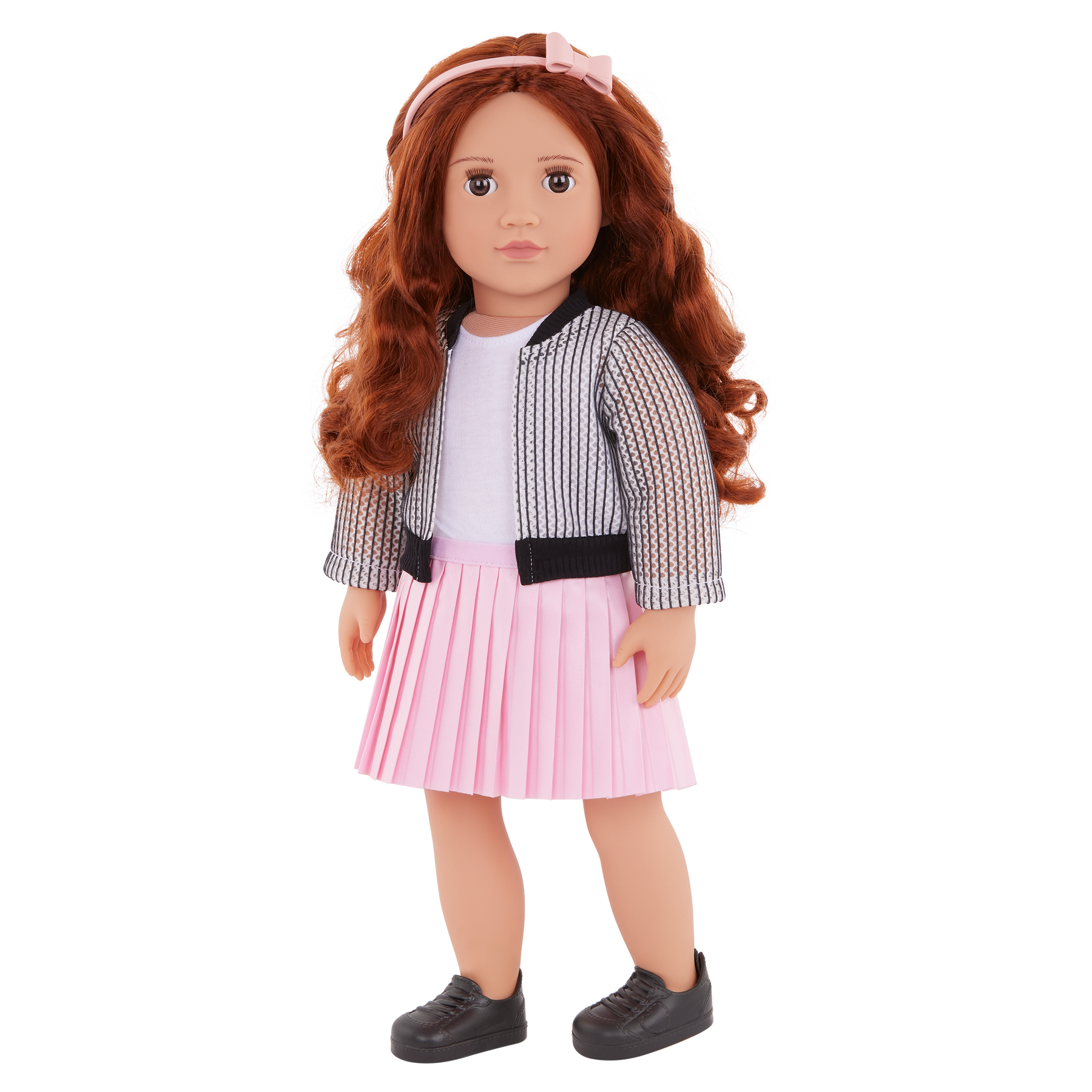 Imaginations can dream up cute styles and fun stories with Jacinta! This Our Generation 46cm doll has a huggable soft body and lifelike features to delight doll fans during playtime. Her beautiful brown eyes open and close, and her wavy auburn hair can be styled into ponytails, braids, updos, and more. Plus, little stylists can complete each look with the cute headband accessory! Jacinta arrives wearing a casual top, a bright pink pleated skirt, and a stylish jacket for kids to take storytelling outdoors! When it's time for dress-up, her outfit has easy-open closures to quickly put on and remove. So fashion lovers can mix, match, and set new trends on every adventure! Our Generation dolls make a great gift for kids ages 3 and up and encourage them to create their own unique stories.