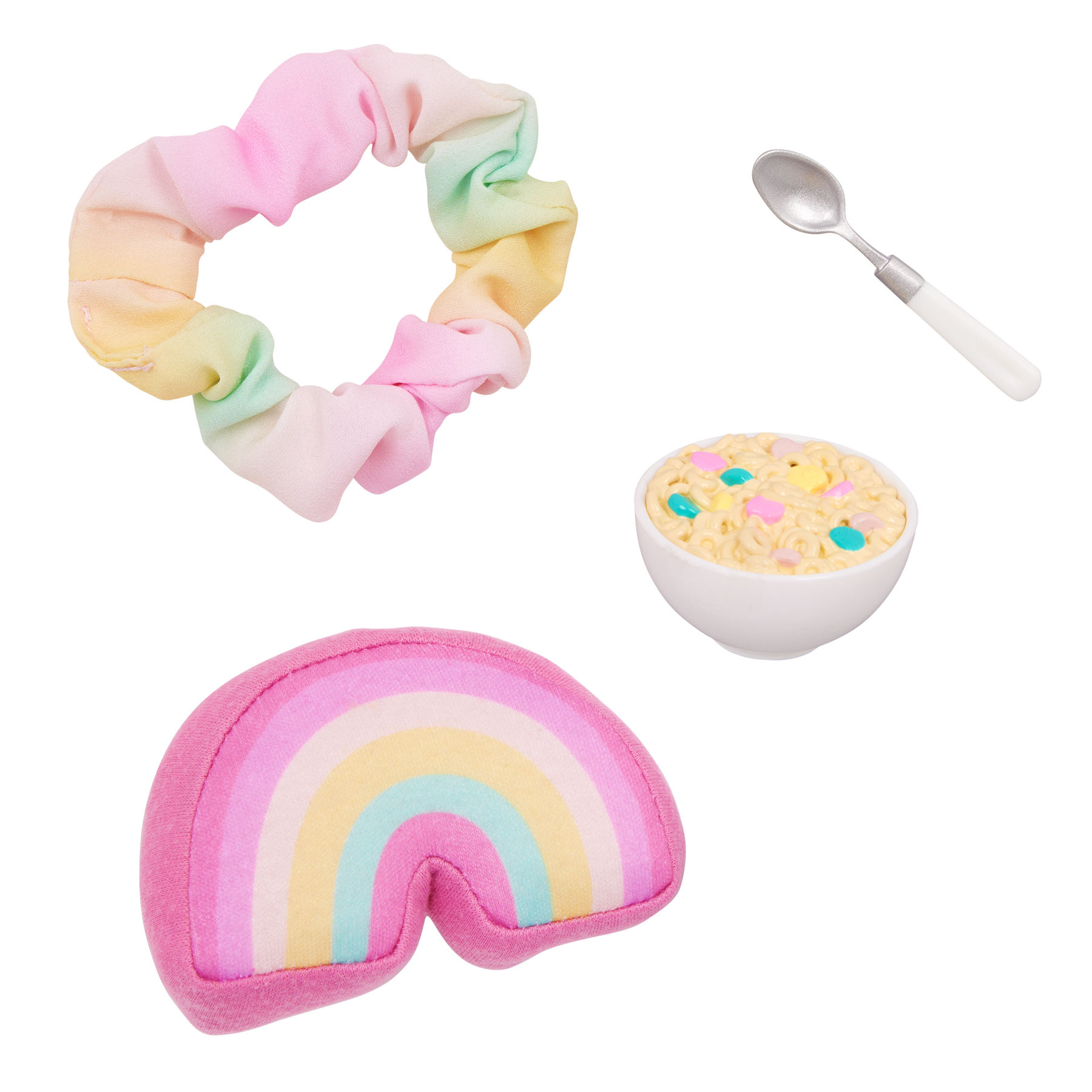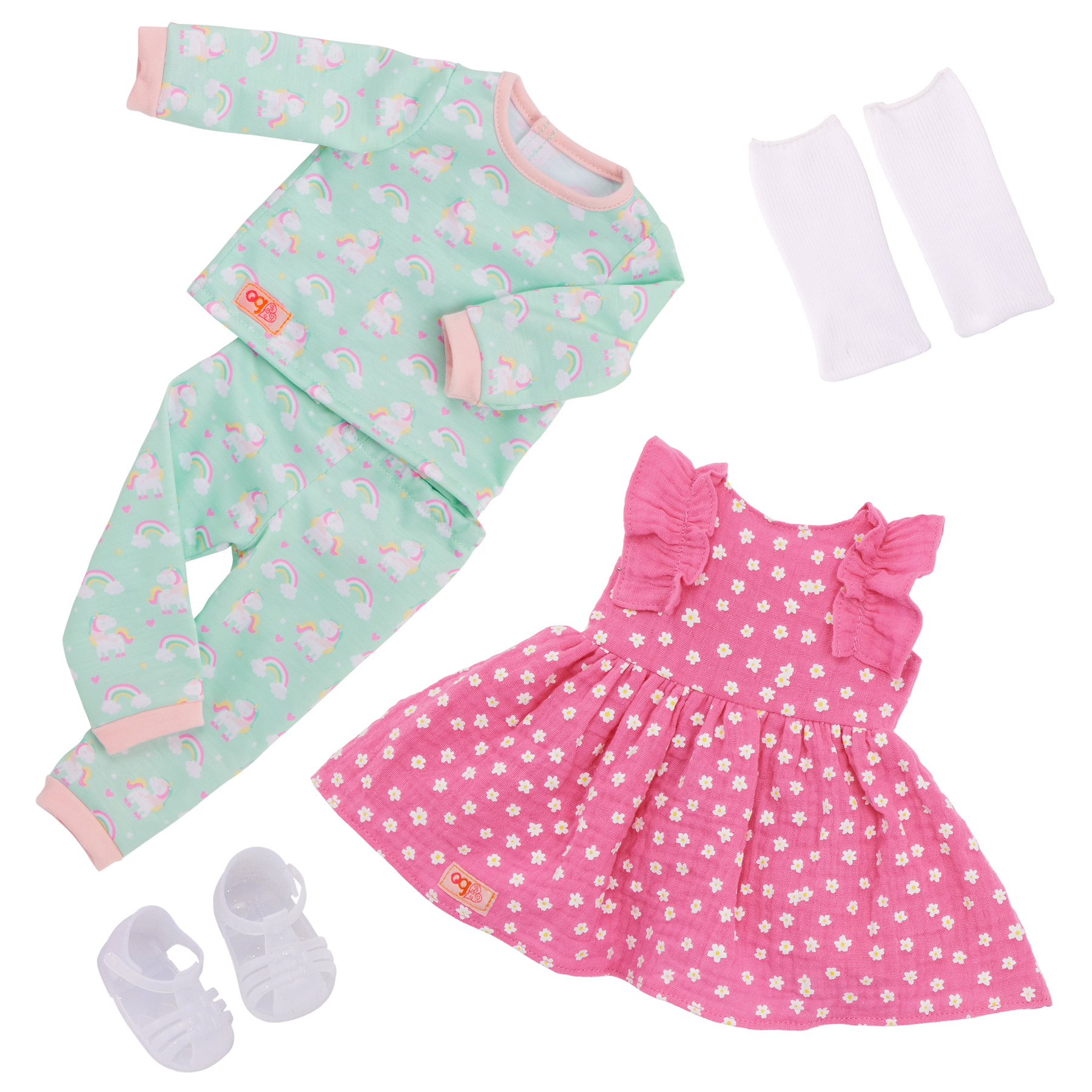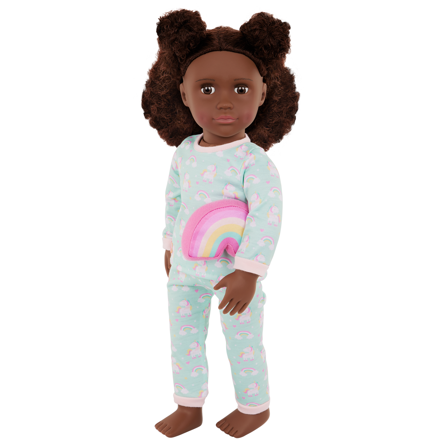 Explore double the dress-up fun with Our Generation 46cm doll Zoey! She wears a cute pink dress decorated with mini florals and comes with a bonus rainbow pyjama! Themed accessories like a hair scrunchie, rainbow pillow, tall socks, a bowl of cereal, and a spoon add an extra fun touch to pretend slumber parties and bedtime storytelling. Zoey also has a huggable soft body and lifelike features that will delight doll fans during playtime. Her curly, dark-brown hair is fun to style, and her beautiful brown eyes really close when it's time for sweet dreams! During dress-up, each outfit has easy-open closures to quickly put on and remove. So you can mix, match, and create even more stylish looks on any adventure! Our Generation dolls make a great gift for kids ages 3+ (small parts), encouraging them to imagine their own unique stories.