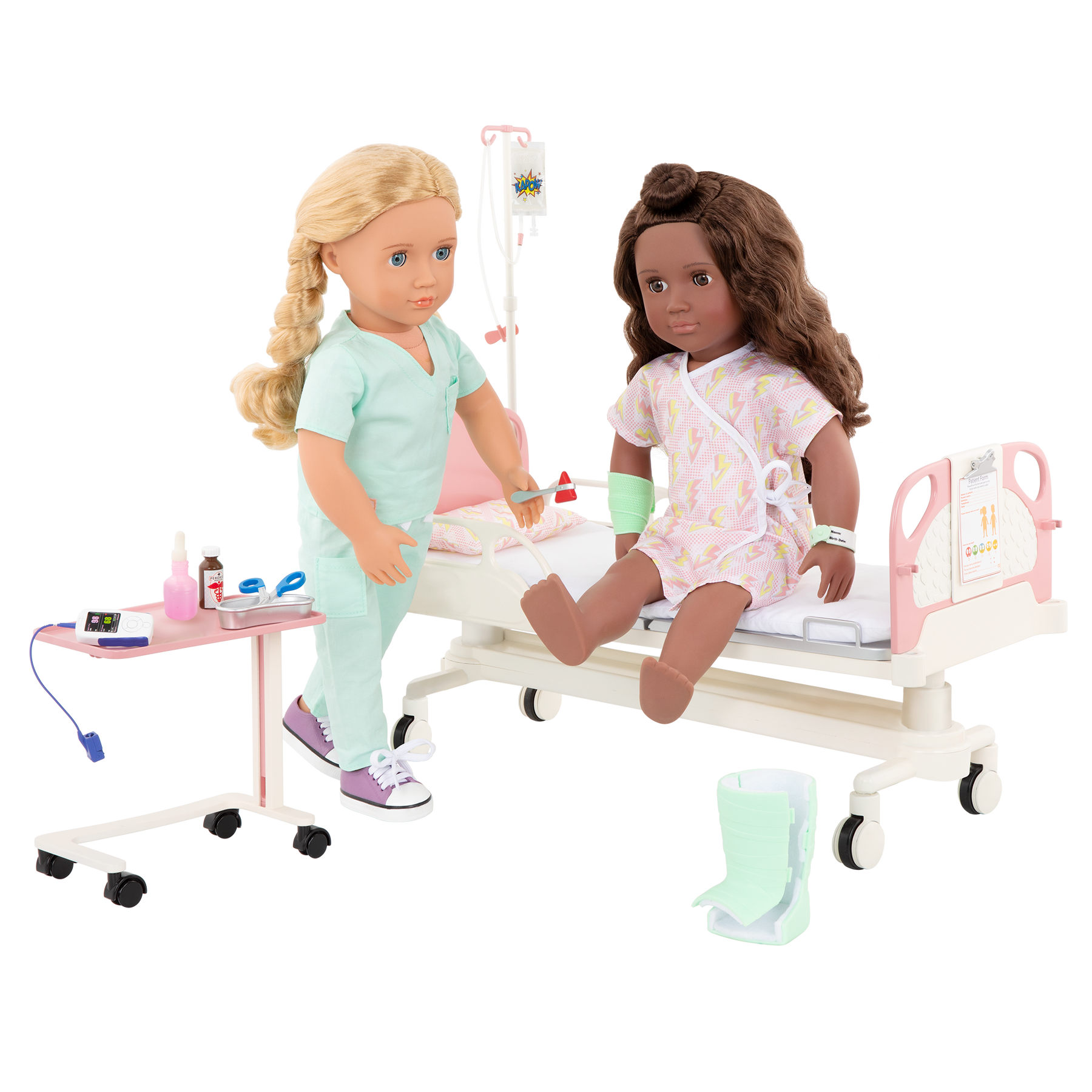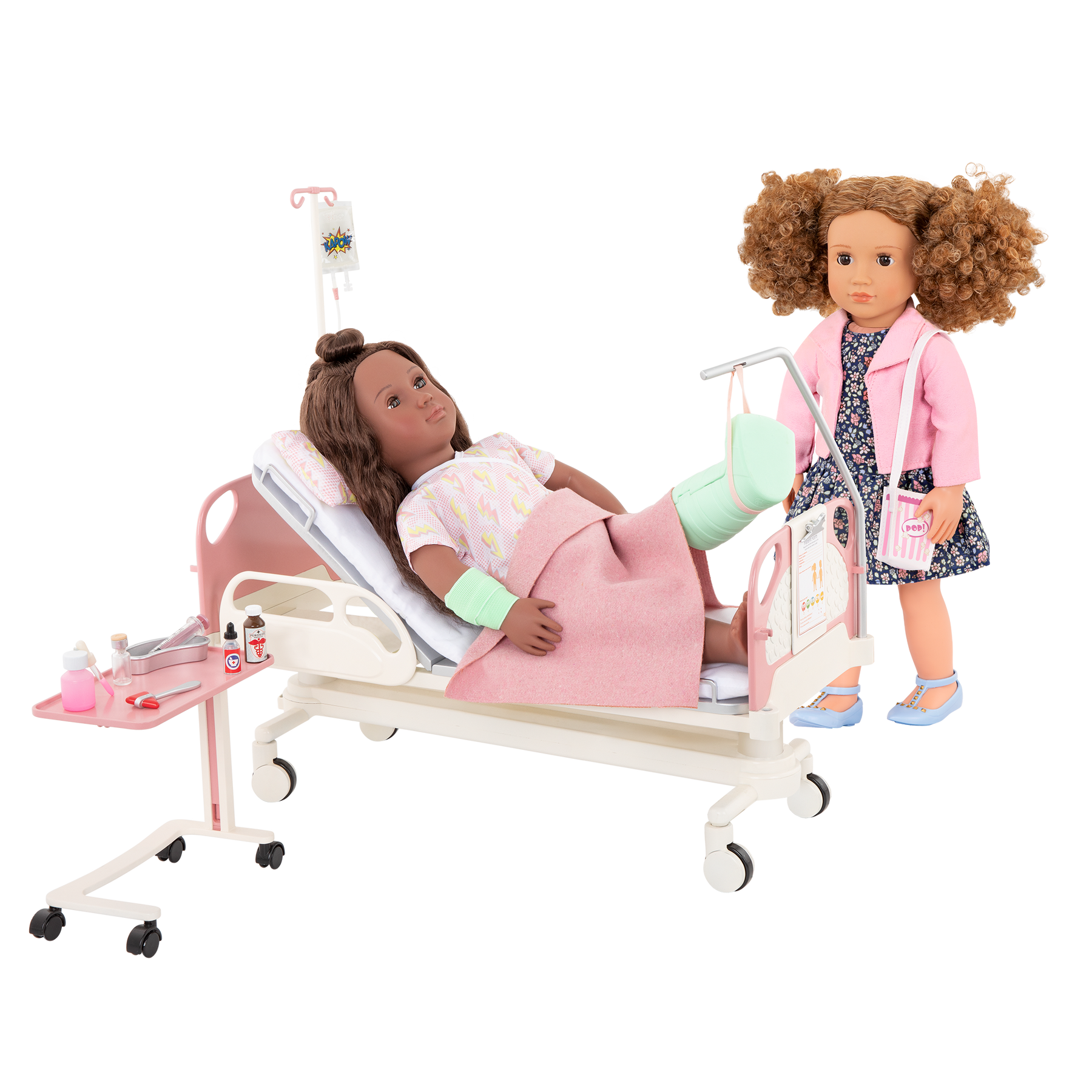 Take super care of your 46cm dolls with the Our Generation Get Well Bed and realistic doctor accessories! Dress your doll in the hospital gown and have them rest on the adjustable bed – it easily elevates from flat to seated to keep your besties comfy. Which of your dolls has medical training? Play as the doctor by putting on the stethoscope to listen to your patient's heartbeat, or test her reflexes with the cool reflex hammer! Wrap the leg cast around your doll's foot and place it in the sling for extra support as she recovers. Don't forget to fill out the forms to keep track of all the information – just like a real doctor does! After the checkup, keep the accessories neatly on the rolling service table and snuggle up under the comfy blanket for a speedy recovery!