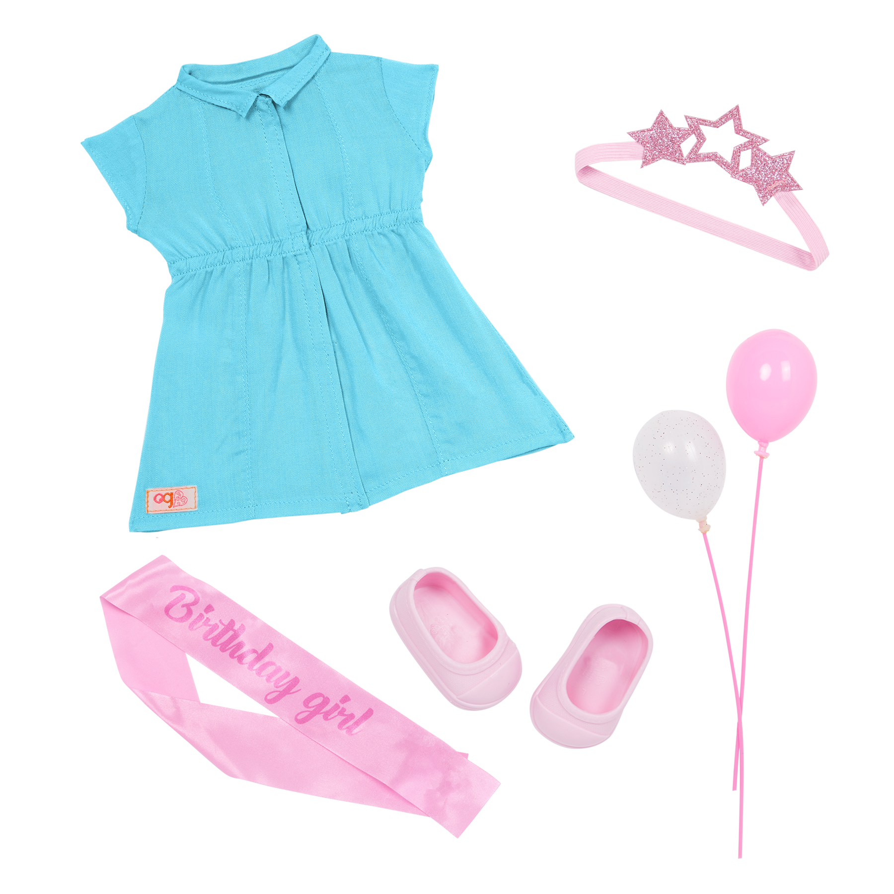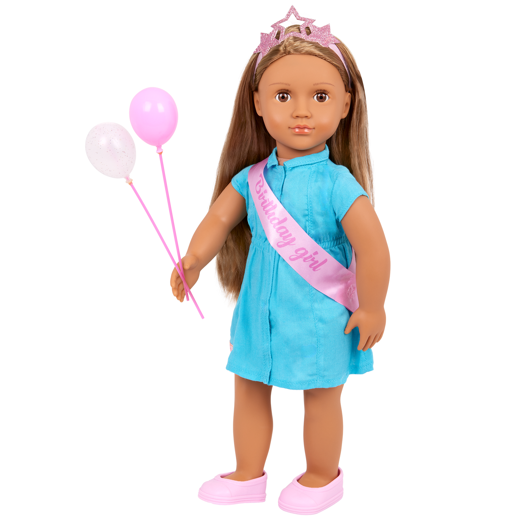 Shout surprise and shine with Anita, the Our Generation 46cm doll who's ready for a party! Birthdays are so much fun, and Anita can't wait to invite everyone to the celebration. She's dressed in a bright blue dress with matching accessories, including a birthday girl sash, sparkly star headband, and balloons to set a fabulous party scene! Anita has beautiful brown eyes that open and close with long blonde hair that's fun to style before the guests arrive. Her outfit also features easy-open closures to quickly put on and remove, and you can share the accessories with most 46cm dolls to celebrate their big day too!