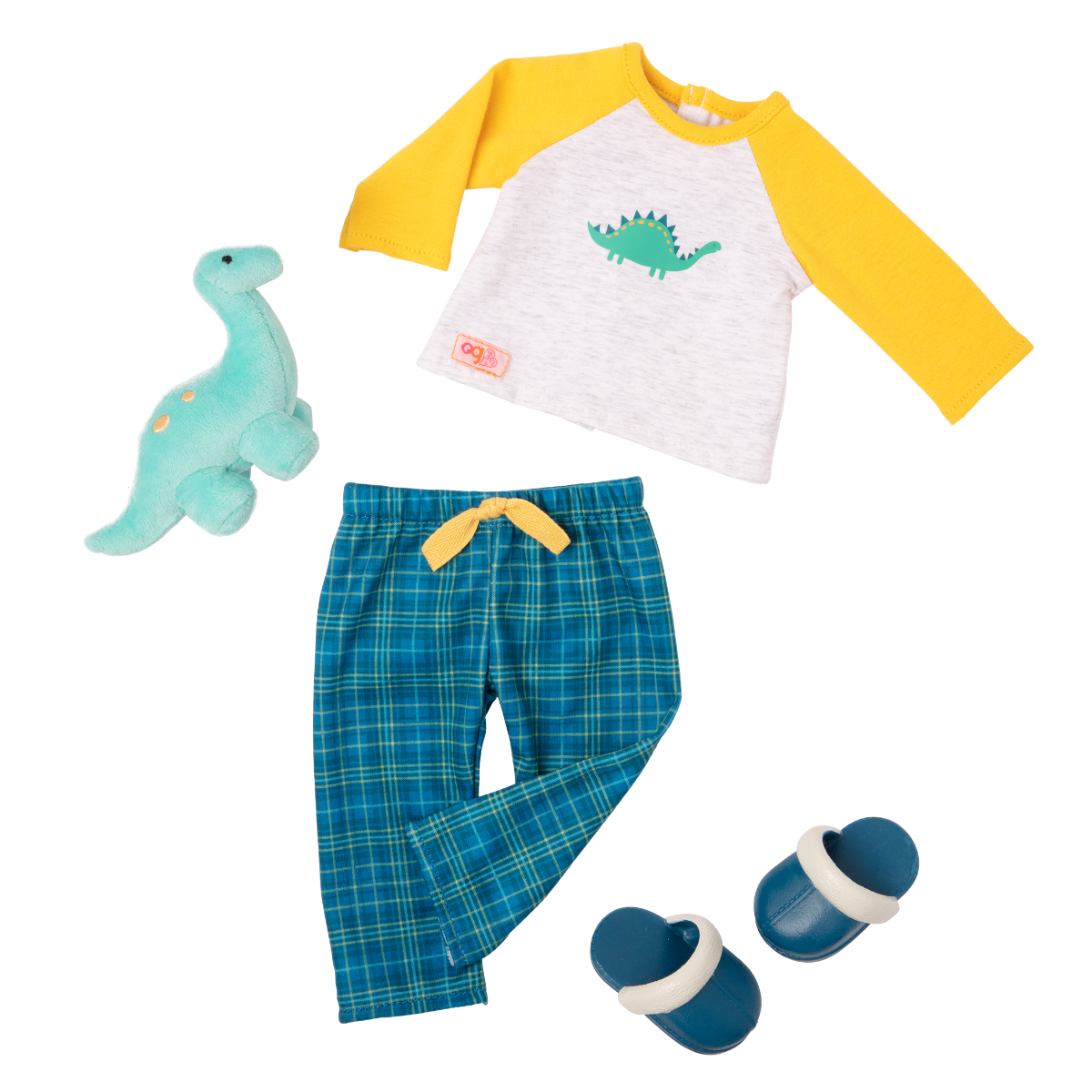 Big dreams await with the Our Generation Dino-Snores outfit for 46cm dolls! This pyjama set features easy-open closures to quickly put on and remove, so your boy dolls can snuggle up right away! Start with the long-sleeve top with a cool Stegosaurus graphic and add the matching flannel-style bottoms to keep them cosy. Then put on the comfy slippers to keep their feet warm as they get one last drink of water before bed. Sleep time! Make room for the super soft dinosaur stuffed animal and give your dolls the perfect nighttime buddy – Rawrr! (Dolls sold separately)