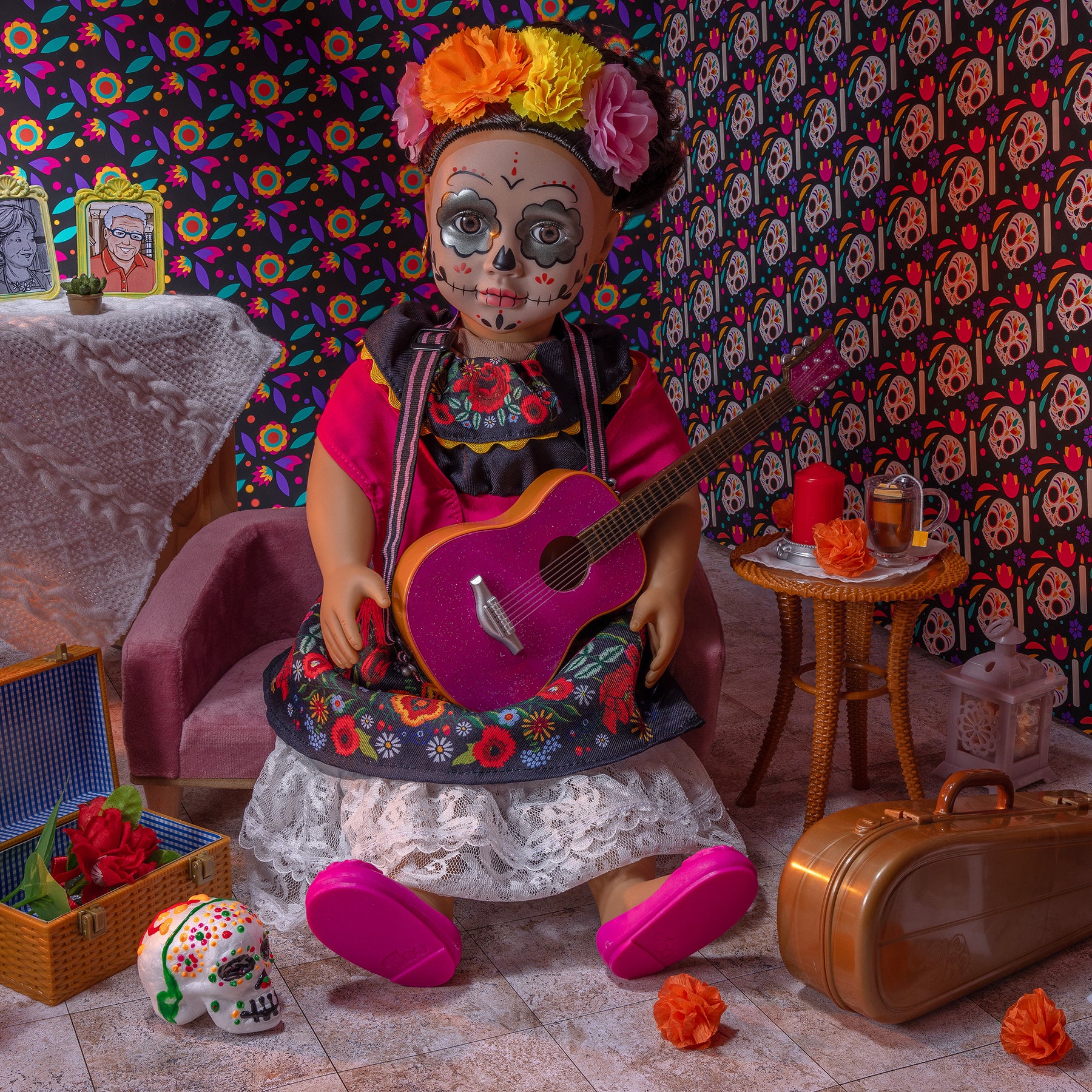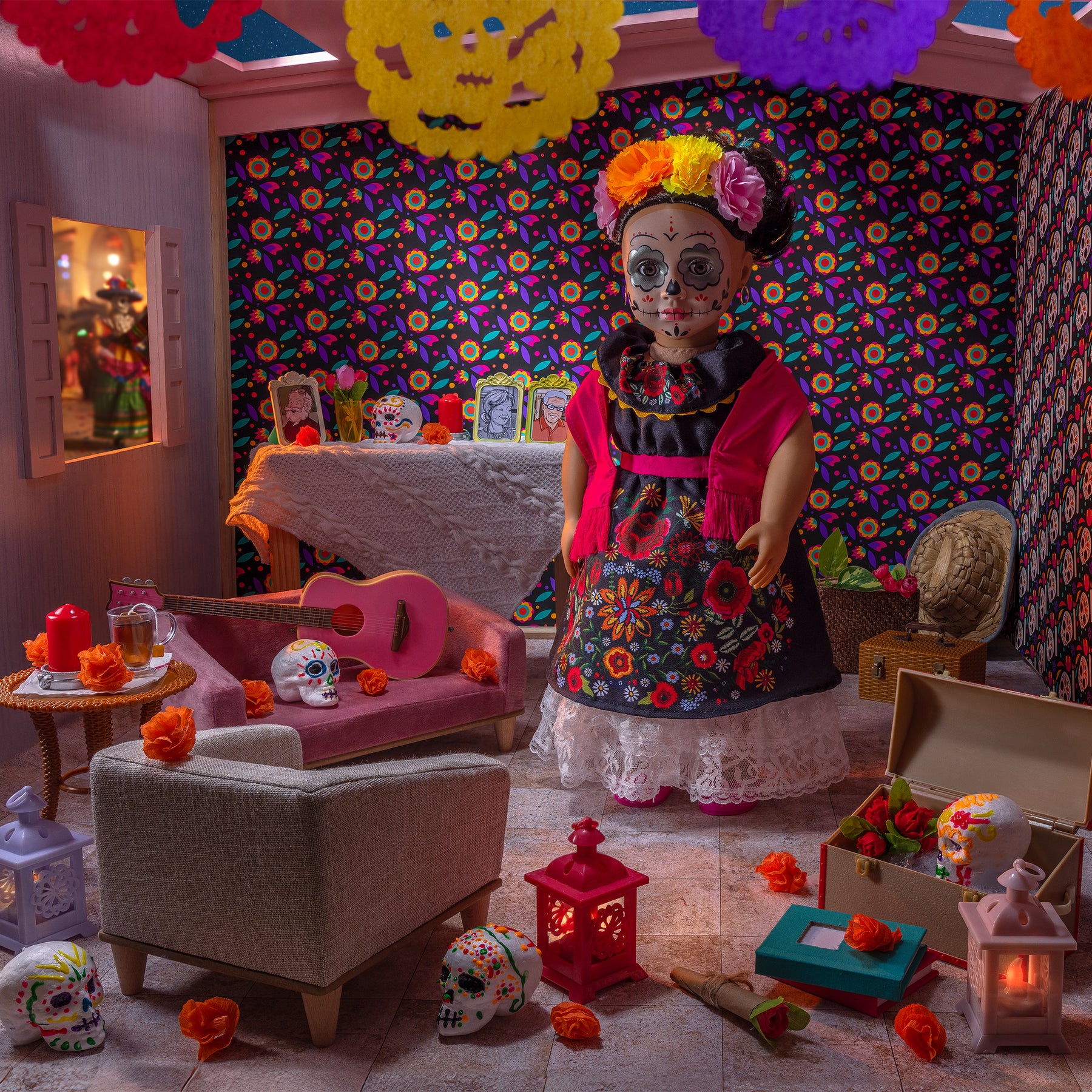 Our Generation 46cm doll Esperanza embraces the beautiful traditions of Día de los Muertos and encourages kids to learn about cultural identity in a fun and engaging way. Known as Day of the Dead, this celebration originated in Mexico and honours loved ones through music, food, and rituals. Esperanza pays tribute to her Mexican heritage with striking yet playful "calavera" (skull) face paint inspired by La Catrina - an iconic symbol in Mexican culture that reminds us how Día de los Muertos is a time to honour family, life, and happy memories. Plus, her vibrant flower crown and Tehuana-inspired dress are adorned with signature flowers like "cempasuchil" (marigolds) and "clavel" (carnations). These flowers are also used to decorate altars in homes called ofrendas, which provide a sense of connection to past generations, while the Tehuana dresses (worn by the women in Oaxaca, Mexico) display strength, beauty, and cultural pride. Esperanza has a huggable soft body, pierced ears with removable hoop earrings, wavy brown hair, and lifelike dark-brown eyes that open and close. She comes in special edition packaging with illustrations of sugar skulls and florals seen throughout the festivities. Clothing has easy-open closures to quickly put on and remove as kids explore storytelling and self-expression. Compatible with most 46cm dolls, doll clothes, and accessories. This Our Generation Día de los Muertos doll makes a wonderful gift for kids ages 3+ (small parts).